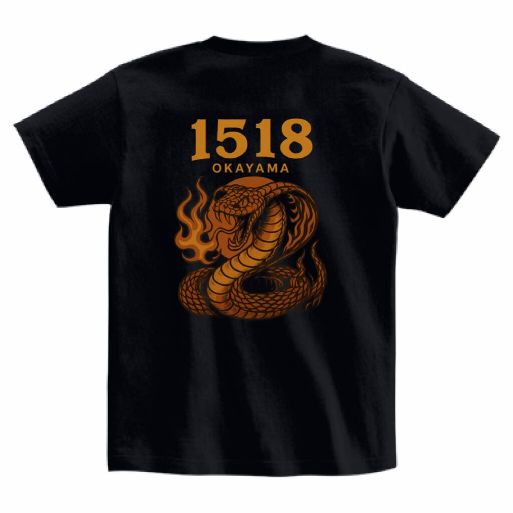 「1518」と「OKAYAMA」の文字をビンテージ調のオレンジであしらい、背景には燃え上がる炎が力強さを引き立てます。